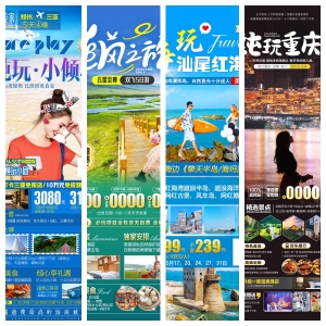 - 地域化精准覆盖:深度整合云南大理(苍山洱海)、重庆(魔幻山城)、海南(椰林海岸)、三亚(热带海湾)、厦门(鼓浪屿)等5大热门旅游目的地的地标性景观元素,模板内置各城市专属视觉符号(如大理扎染纹理、重庆轻轨穿楼剪影),满足不同地域旅游活动的精准宣传需求。