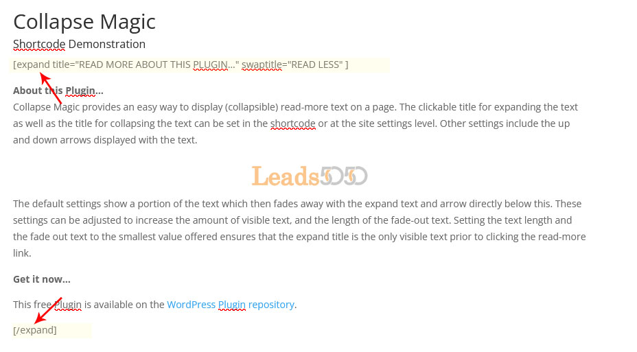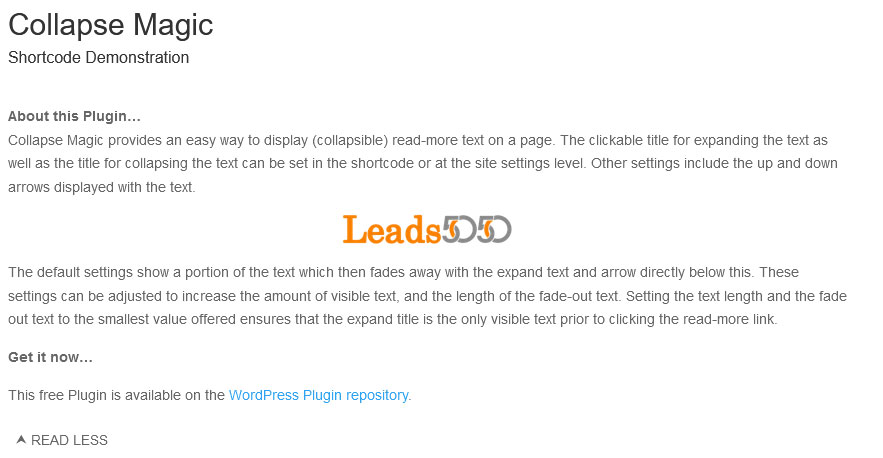 - Use alternate ‘read-less’ text if this is required in the shortcode as [magic_expand swaptitle=”NEW READ-LESS TEXT”].