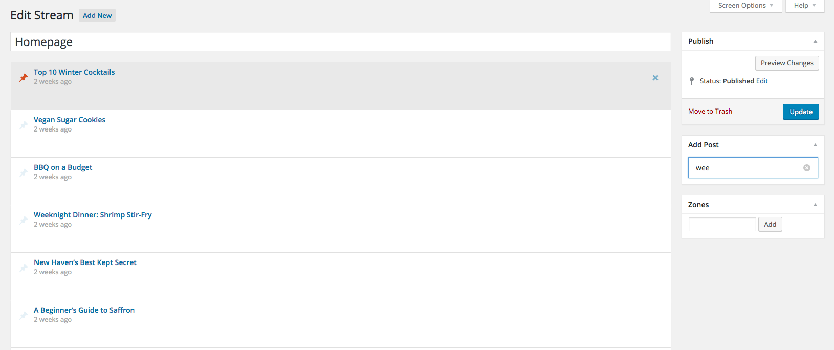 Stream Manager provides a simple interface for curating feeds of new posts from the WordPress Admin. New posts show up automatically at the top of a stream, but content can easily be added, removed, or repositioned on the page via the stream editor. Admins also have the option of pinning a post, which will lock it in its current position regardless of new content.