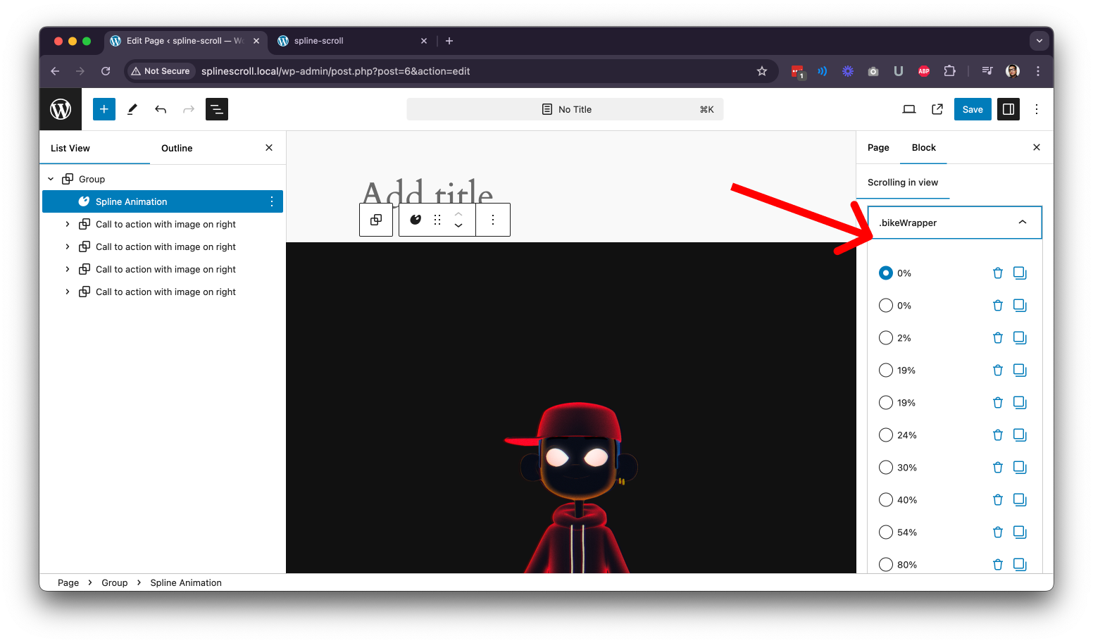 - Click on the Spline animation to add the block