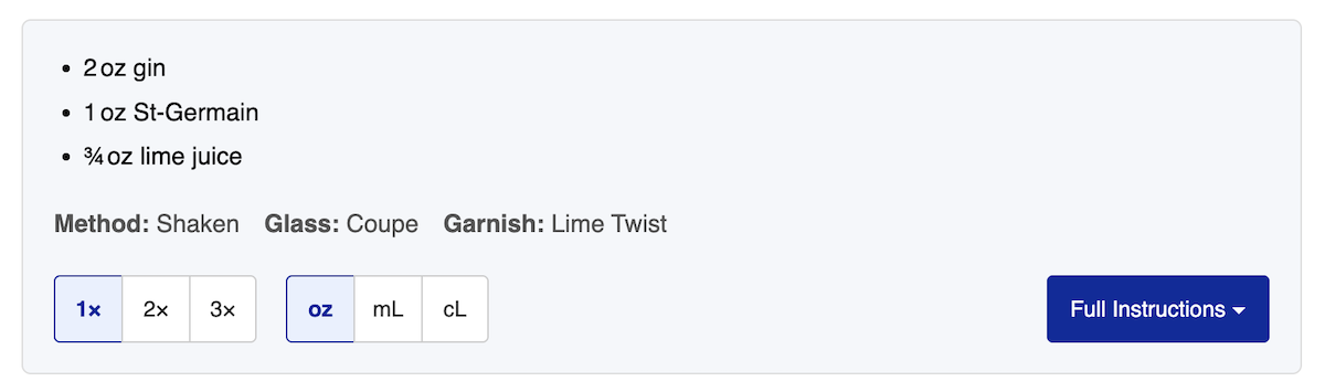 Cocktail recipe rendering (summary view)