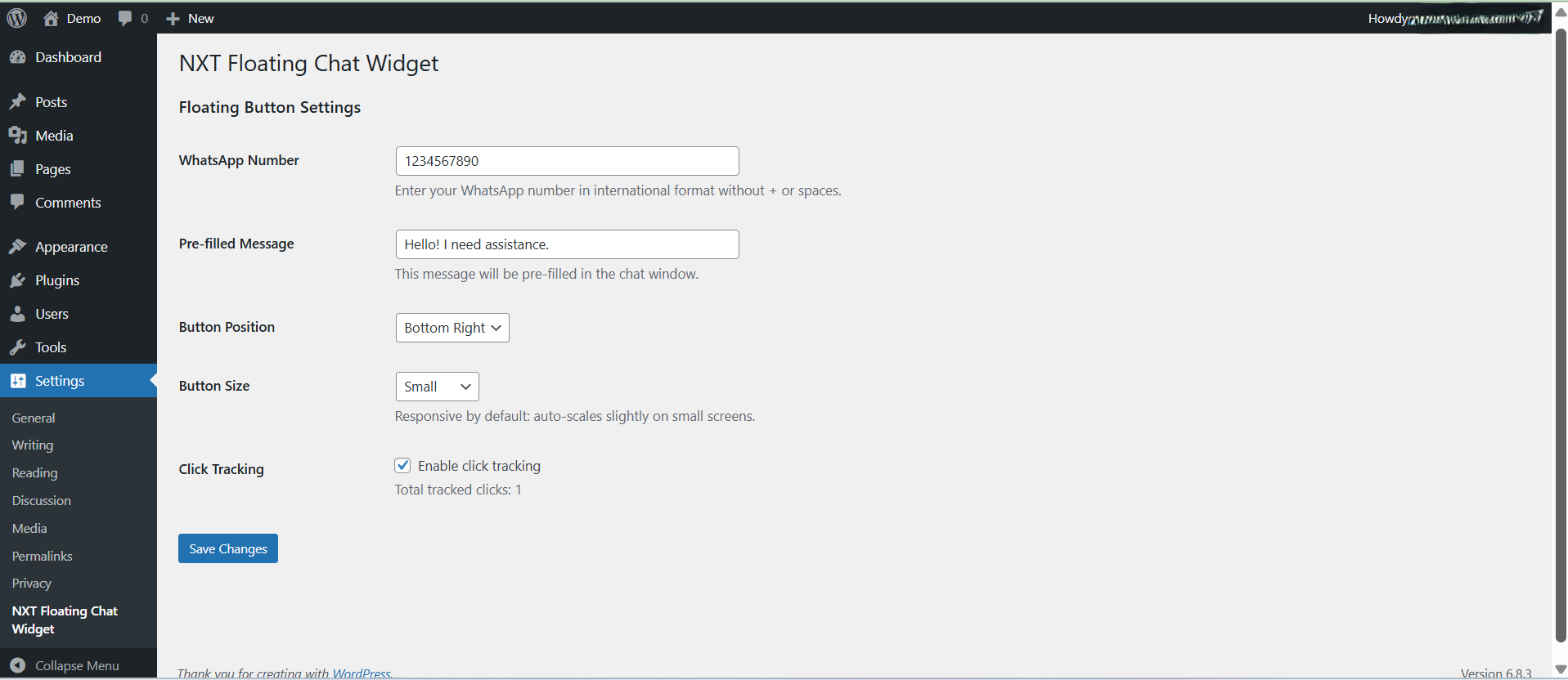 - Go to Settings NXT Floating Chat Widget to configure your WhatsApp number, message, position, size, and tracking.