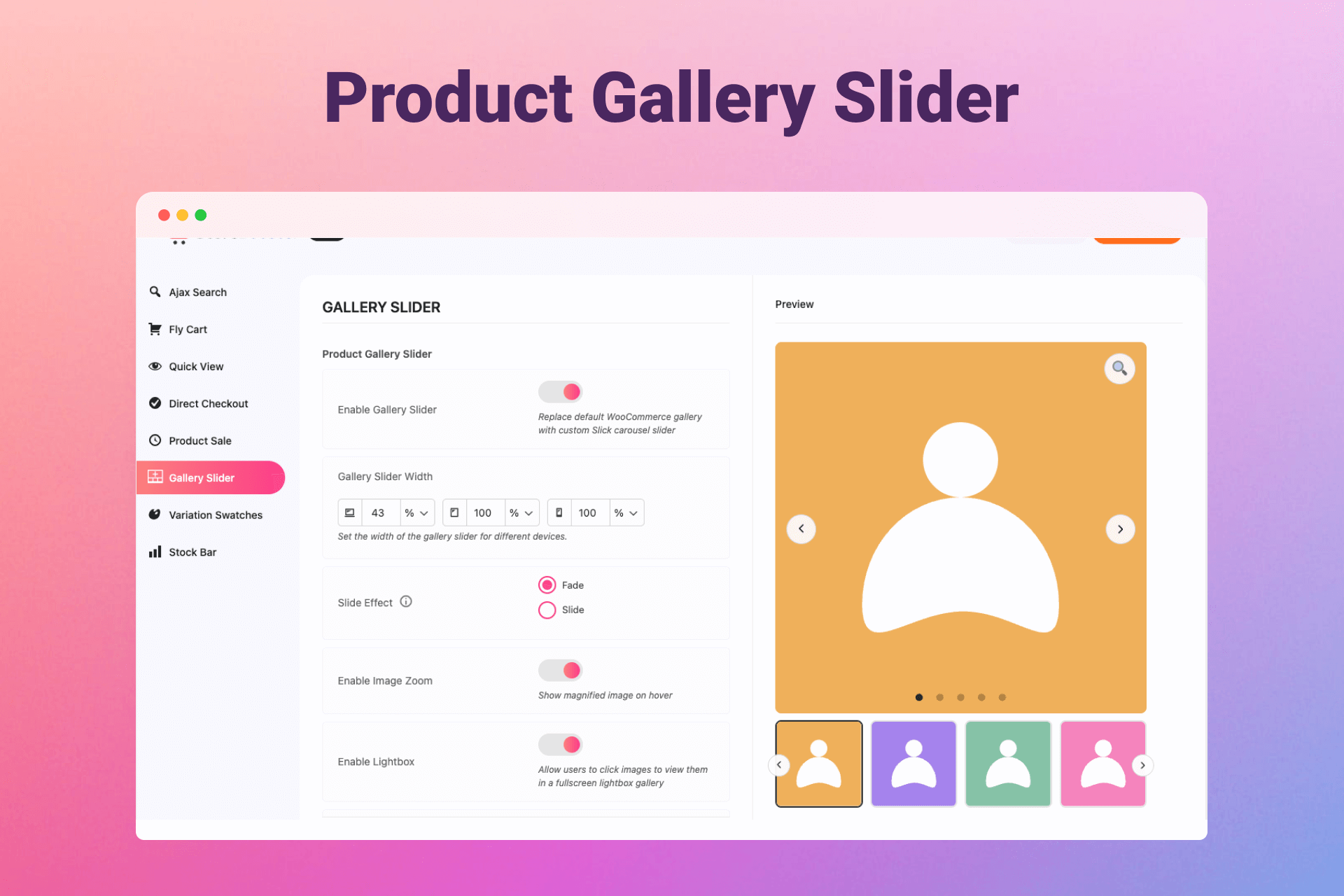 Yes, when enabled, the Gallery Slider replaces WooCommerce’s default product gallery with a modern slider powered by Slick carousel.