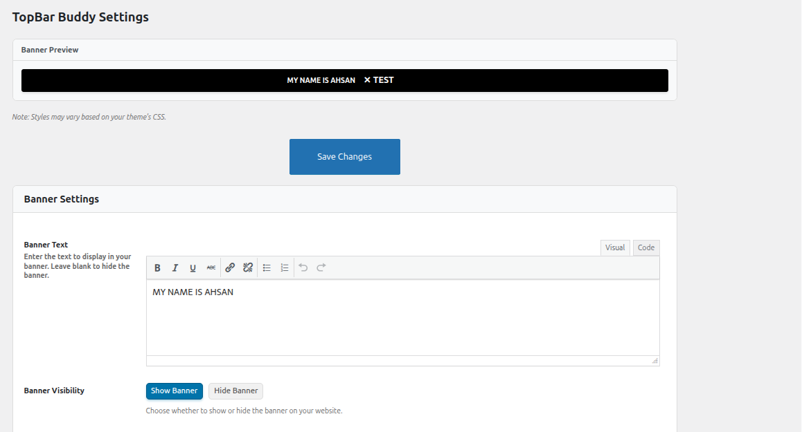 - Go to ‘TopBar Buddy’ in the WordPress admin menu to configure your banner.