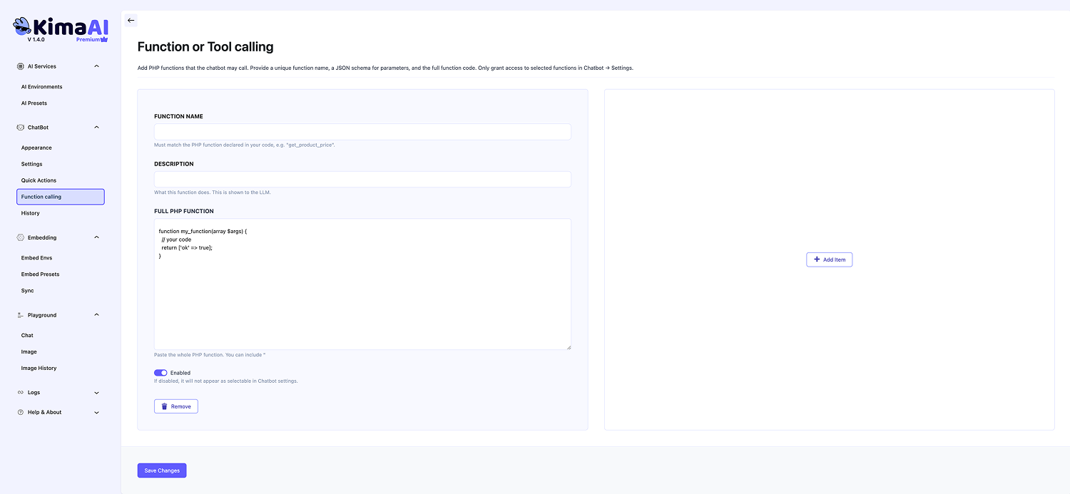 - Extend KimaAI via developer hooks/filters to register and control custom tools and tool execution.