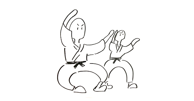 また、その人たちがどんな服を着ているのか思い出せずなぜか空手着を着せ、さらに後ろにもう1人描いておそろいにしたところでタイムアップ。もう空手ですらない。