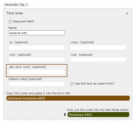 This will add the extra field to the “Generate Tag: Text area” screen on the Contact Form editor.