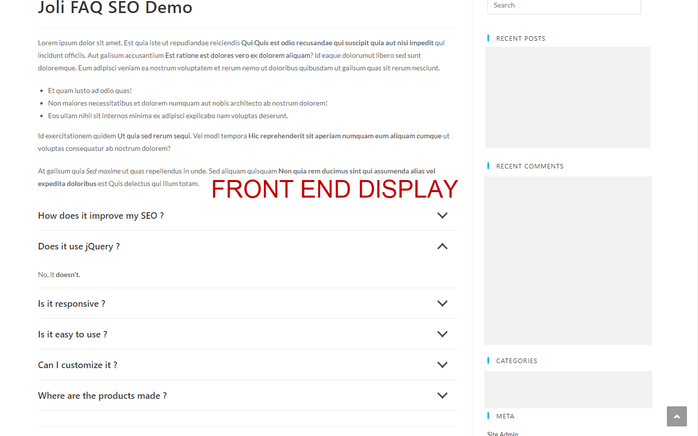 ❌ NO jQuery: Unlike most of the FAQ plugins, Joli FAQ SEO does not use jQuery on the front-end, ✅ Only plain Javascript packed in a tiny <4KB minified file.