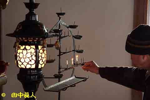 厄除け祈願に訪れた3人の数のローソクに火を灯して祈願する。
