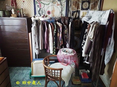 簡易型組み立て衝立におふくろが気に入っていた洋服がいっぱい。