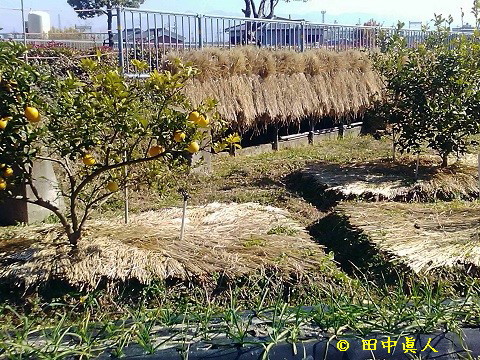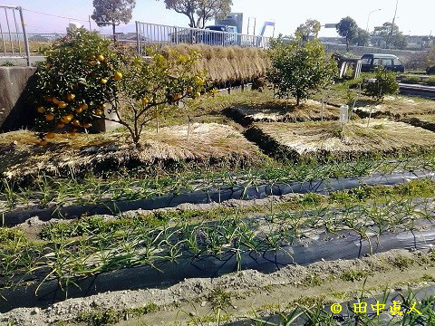 ここの田主の現在は、玉葱つくりに柑橘類。防虫の役割もある。