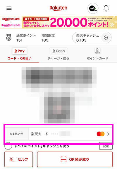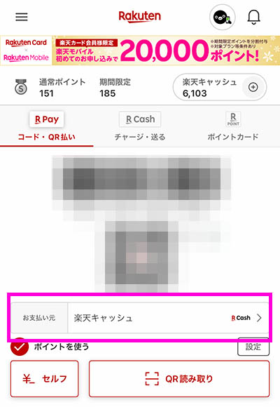 「コード・QR払い」の画面では、中ほどの「お支払い元」を切り替えることで、楽天カードから出金するのか、楽天キャッシュ(チャージ残高)から出金するのかを選ぶことができます。