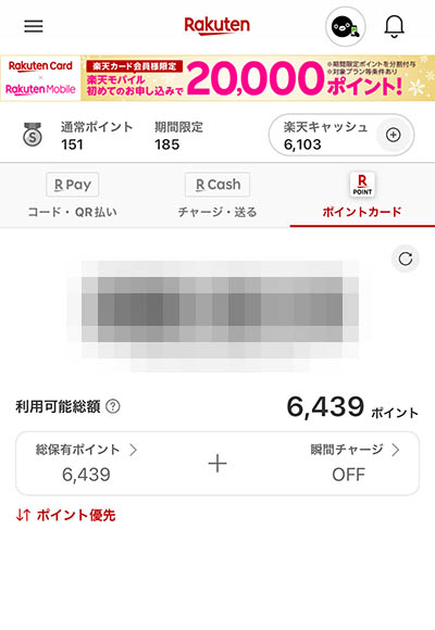 こちらは「楽天ポイントカード」の画面です。楽天ポイントアプリを別途開かなくても、楽天ペイ内からポイントカードを開いて提示することが可能です。上記キャンペーン(1)の『楽天ポイントカード提示』はこの画面を指します。