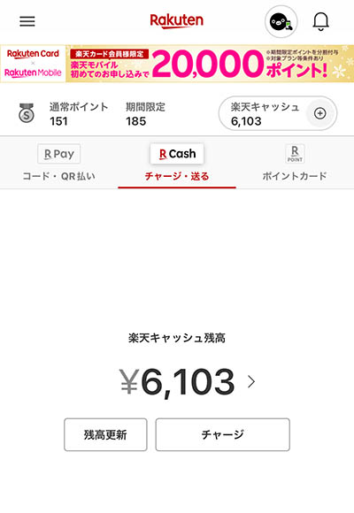 - 「楽天ペイ」アプリで「楽天キャッシュ」(チャージ残高)からの支払いでコード・QR・セルフ払いをする