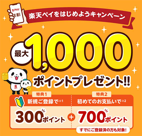 1つ目のキャンペーンは『楽天ペイをはじめようキャンペーン』で、新規登録で300P+初めての利用で700P=合計1,000ポイントが付与されます(初めて利用は既存登録者の初利用も対象)。