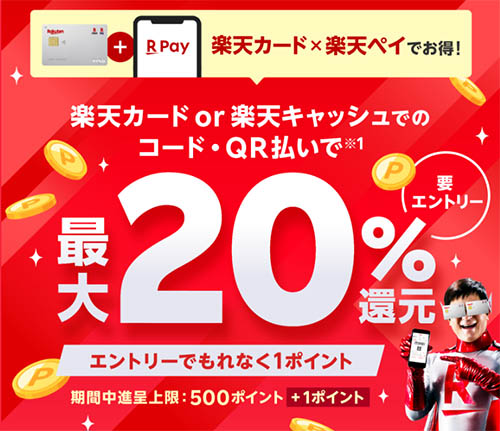 これはチャンスですね。楽天ペイをはじめるだけで1,000円分のポイントが貰えて、20%還元が受けられます。両キャンペーンともエントリーが必要です。