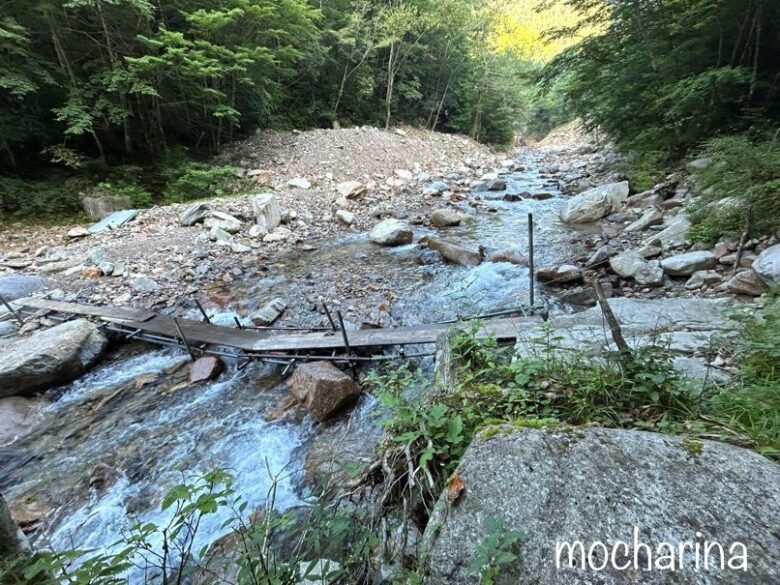 広河原登山口の川に架かる板は雨による川の増水で使用できないことがあります。
