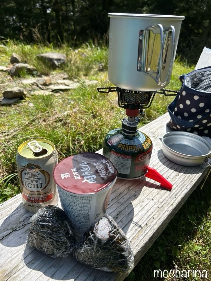 木板で作られたベンチでカップラーメンとおにぎりを食べました。