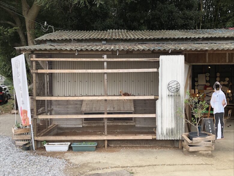 直売所の隣には平飼い小屋があり、10羽ほどの純国産鶏「さくら」と「もみじ」が暮らしています。