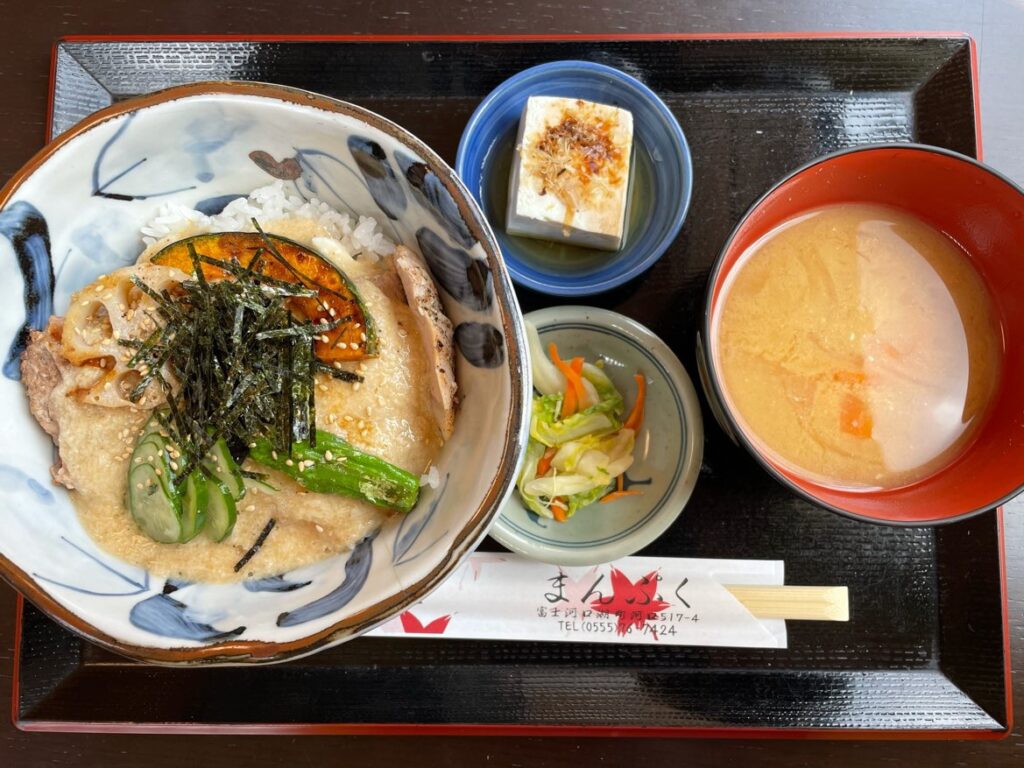 香ばしく焼いた山賊風味のポークソテーに山芋のトロロが豪快に乗ったオリジナルメニューで、ツルツルと喉ごしがいい丼です。