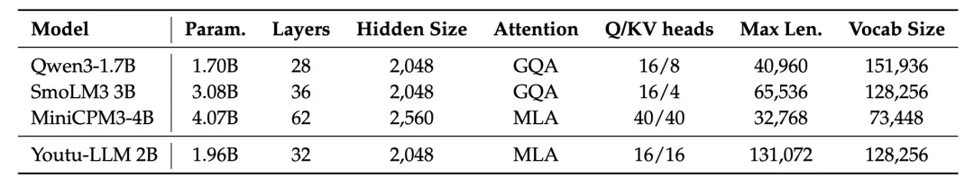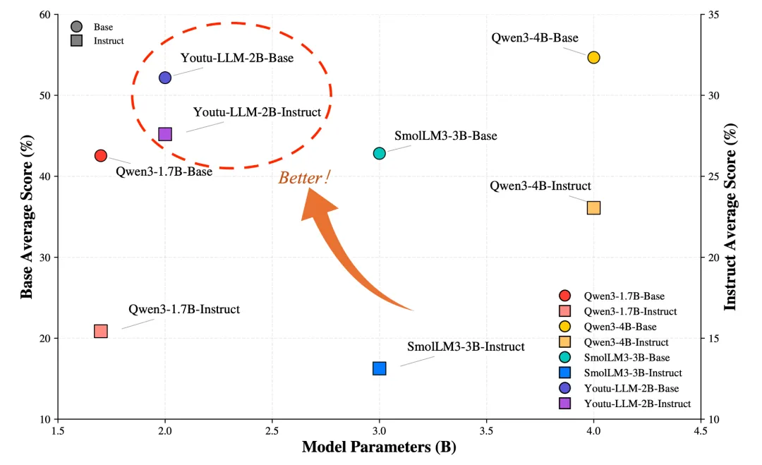 在当前大模型动辄数十亿、数百亿参数的“军备竞赛”中,轻量级模型常被视为“能力有限”的代名词。然而,腾讯 Youtu 团队最新开源的 Youtu-LLM(1.96B)却打破了这一偏见:它在参数不到 2B 的前提下,不仅在通用能力上媲美 4B 级别模型,更在智能体(Agentic)任务中大幅超越同规模甚至更大模型,首次系统验证了轻量模型也能拥有强大的“原生智能体能力”。它不依赖 “蒸馏”(模仿大尺寸模型),而是从零开始预训练,通过创新的训练范式和架构设计,专门培养推理、规划等核心能力,适合资源有限的场景(比如设备端部署)。