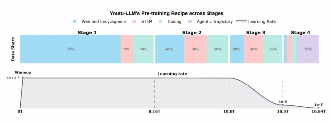 Youtu-LLM 并非简单蒸馏而来,而是 从零预训练,并通过精心设计的课程学习路径逐步提升能力: