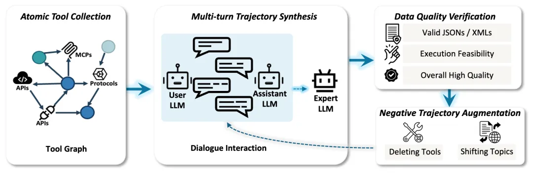 - 工具调用轨迹:覆盖通用 API、MCP 协议等,强化模型与环境的动态交互能力。