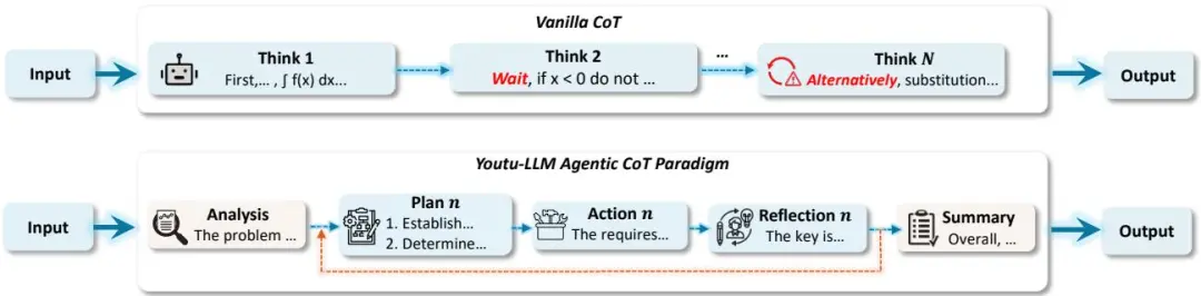 Youtu-LLM 的核心理念是:让模型自身“具备智能体能力”,而非依赖外部框架。通过从预训练阶段就注入“智能体思维范式”,模型可以内化规划(plan)、执行(action)、反思(reflection)等能力,实现“轻量但原生智能”。