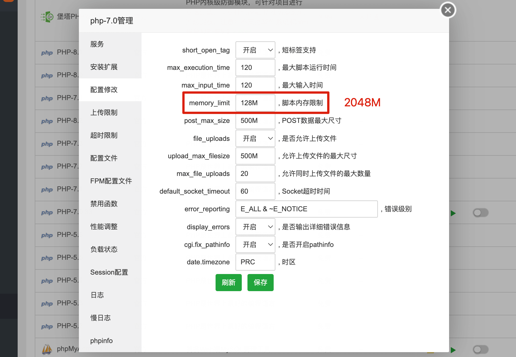 修改 php.ini 配置文件,增加 memory_limit 配置,如 memory_limit = 2048M,重启 PHP 服务