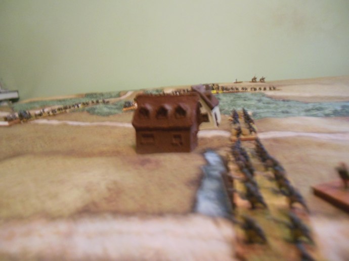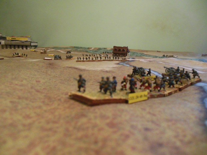 Though outnumbered the French hold Rossignol to begin the game with it’s protection of -2 for cover. Since over half the regiment is in the town the whole regiment is given the bonus. Further, the French 3rd Colonial Division is a veteran unit having seen action in North Africa. They are the best troops that France has at this time with a better rating of Veteran. I also gave them the skirmish stand for their experience in North Africa.