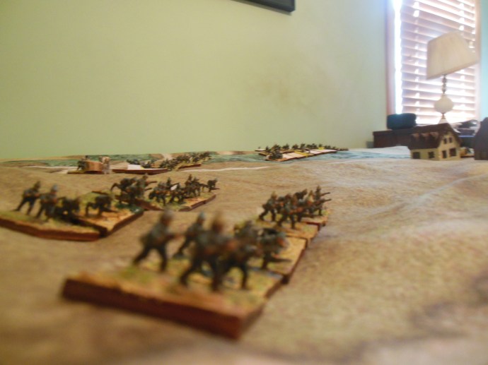 Defensive fire I learn the hard way what can happen to cavalry on the WWI battlefield. First game I had used cavalry and in turn one it was deadly as I got to close to the town on the road with the 12th Infantry Divisional cavalry. Both stands wiped in one shot. Repeating Rifles, Machine gun bonus and and skirmish troop bonus destroyed both stands on turn 1. No offensive fire for Germans out of range.