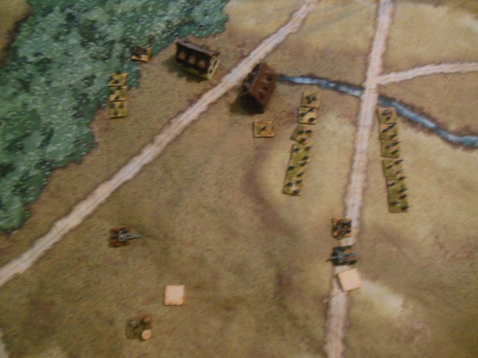 The French take a licking and keep Rossignol. The Germans had lost a stand from two different infantry regiments trading fire with the French in and around Rossignol. It took all the 11th division artillery, the corps. artillery and 3 of the 4 12th Infantry Divisions guns plus 4 infantry divisions to finally force the 1 French regiment in Rossignol down to 1 stand and reduce the one outside by 1 stand. The 1st colonial regiment in Rossignol is forced to retreat and moves south down the road toward Mesnil and Tintigny with it’s remaining 1 stand, a spent unit. The 2nd colonial regiment though was able to move right into Rossignol during the movement phase before the Germans. The East saw a regiment of the 12th infantry division reaching the edge of the woods to come out fire at the infantry regiment from Tintigny with loss to both sides, the Germans following back into the woods edge.