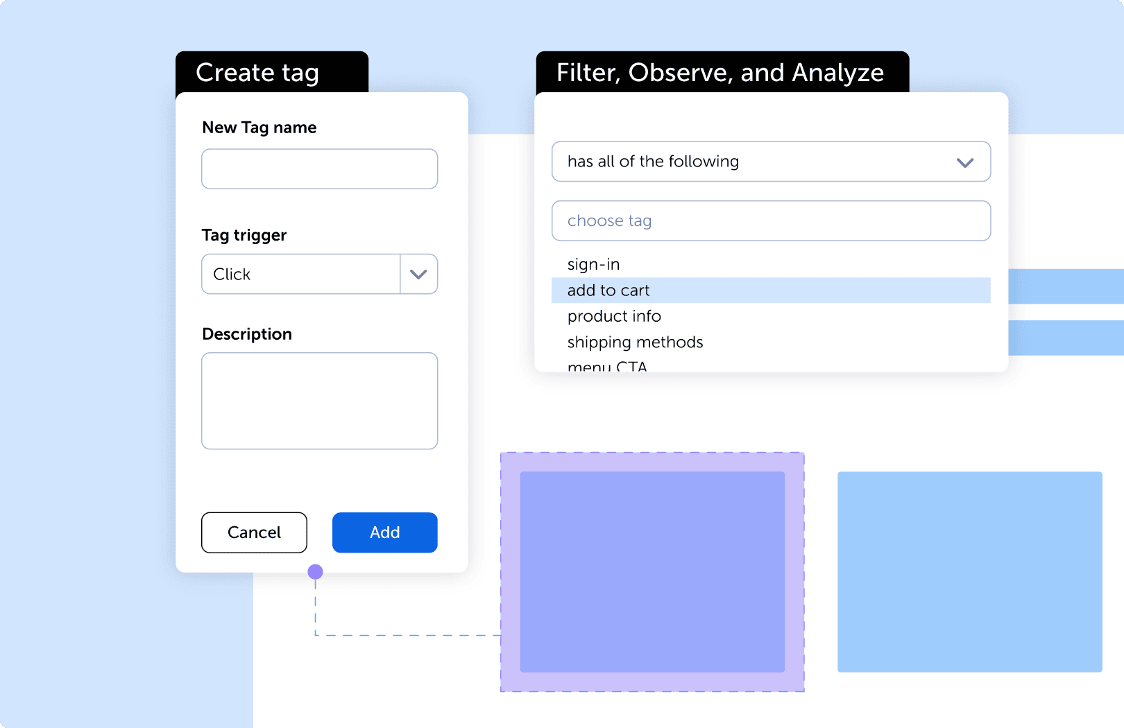 Use custom tags to tag any element on your site and filter users based on their interaction with this element. Discover and analyze behavioral patterns and optimize the user journey accordingly.