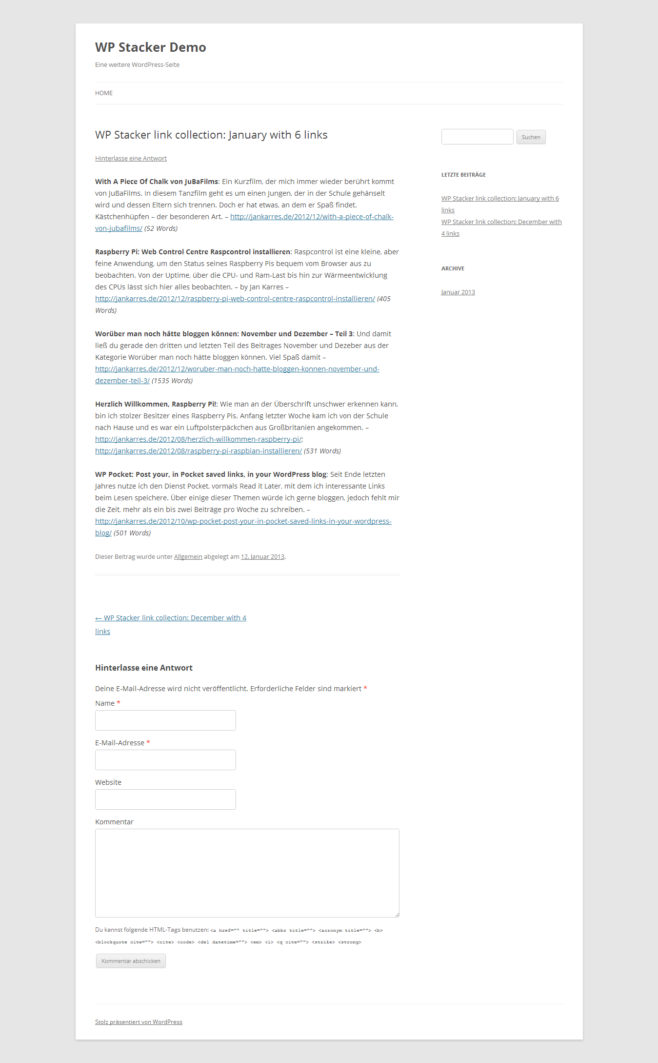 WP Stacker is a WordPress plugin, with which you can post interesting links from Pocket (GetPocket.com) automatically on your blog – with autogenerated titles, discriptions and tags. You can customize the layout of the post completely. So you can save a lot of time, but show all your readers all your interesting links.