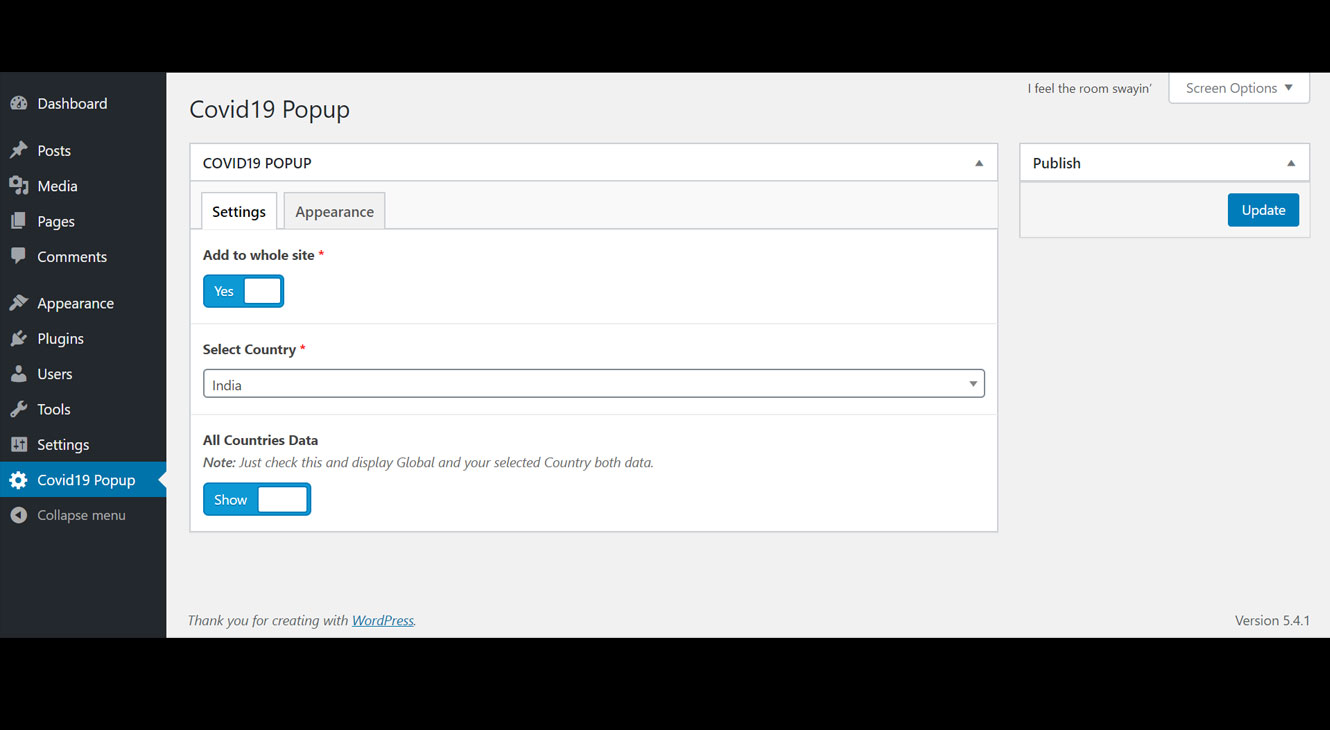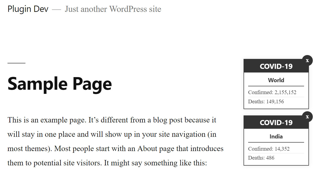 [covid19_popup]to display global data and[covid19_popup country="india"]to display specific country data. -