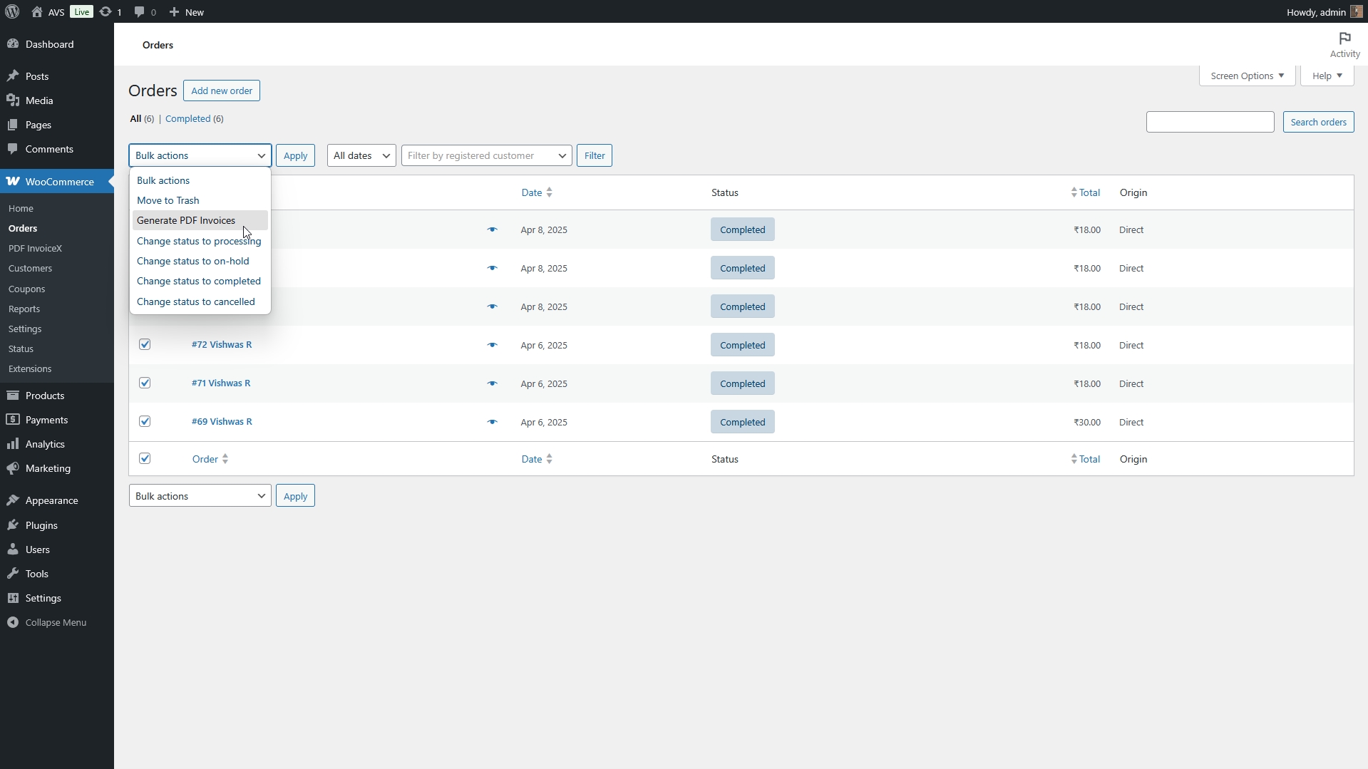 2. Choose “Generate PDF Invoices” from the Bulk Actions dropdown.