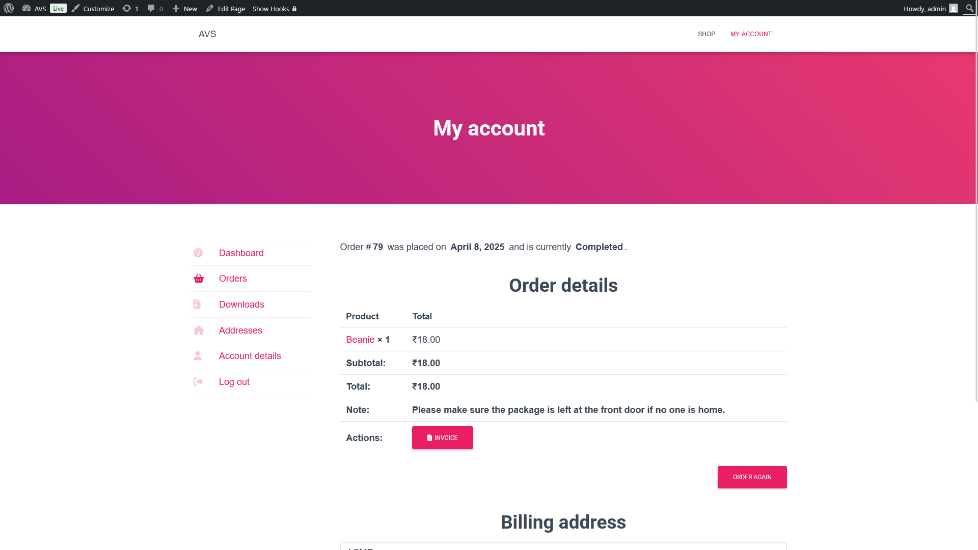Frontend My Account: Customers can download invoices from their order history.