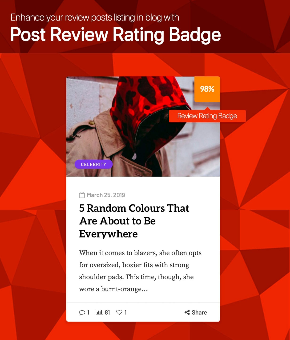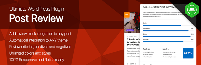 Add detailed post review block with unlimited rated criterias, negatives and positives lists, summary, affiliate buy button and more to any of your WordPress blog posts and display automatic total rating on single post page and blog listing pages.