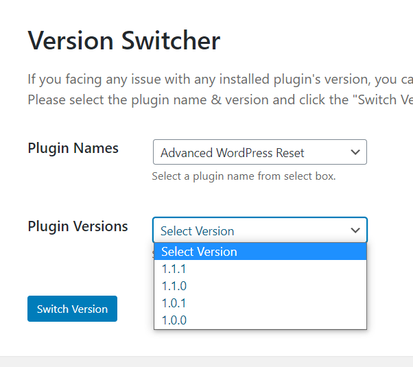 Version Switcher is a simple & awesome plugin. It will help you to switch between the plugin’s version which exists in WordPress org. Some times a user can face trouble with the new update of a plugin, and that time going back to the previous version is a more complex process. In this case ‘Version Switcher plugin’ makes this easy for the users. From the settings page of Version Switcher, you have to select the plugin name & version in which one you want to switch, then click the switch version button, then the process will be done in a few moments. you can save your valuable times by using this plugin.