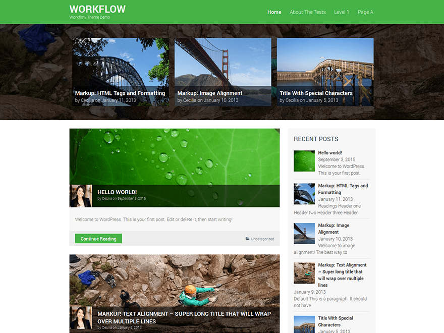 Workflow is a clean and fully responsive blogging theme with an optional home page slider to feature your best posts. It has a range of out of the box customizer options for the logo and header layout, favicons, colors, author bios and social media icons. Author pics are powered by Gravatar so you’ll want to make sure all authors set up a Gravatar account associated with their site email address.