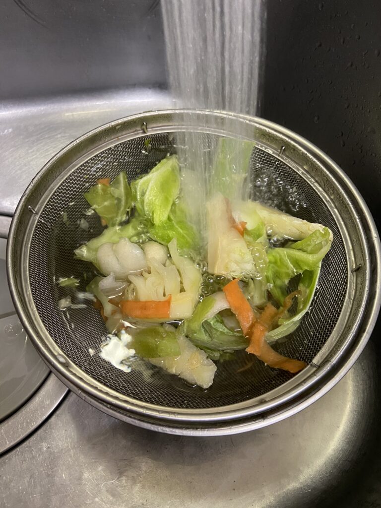 冷凍しておいた野菜は冷凍焼けや冷凍庫の臭いが表面に付着しているので軽く濯ぎ洗いをする。