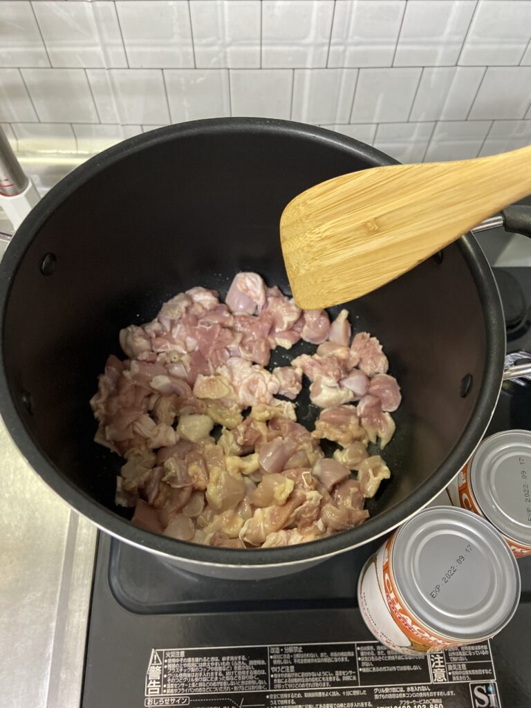 まずは小さめにカットした鳥もも肉をサラダ油を引いた中火の鍋で焼く(サラダ油は分量外で小さじ1ぐらい)