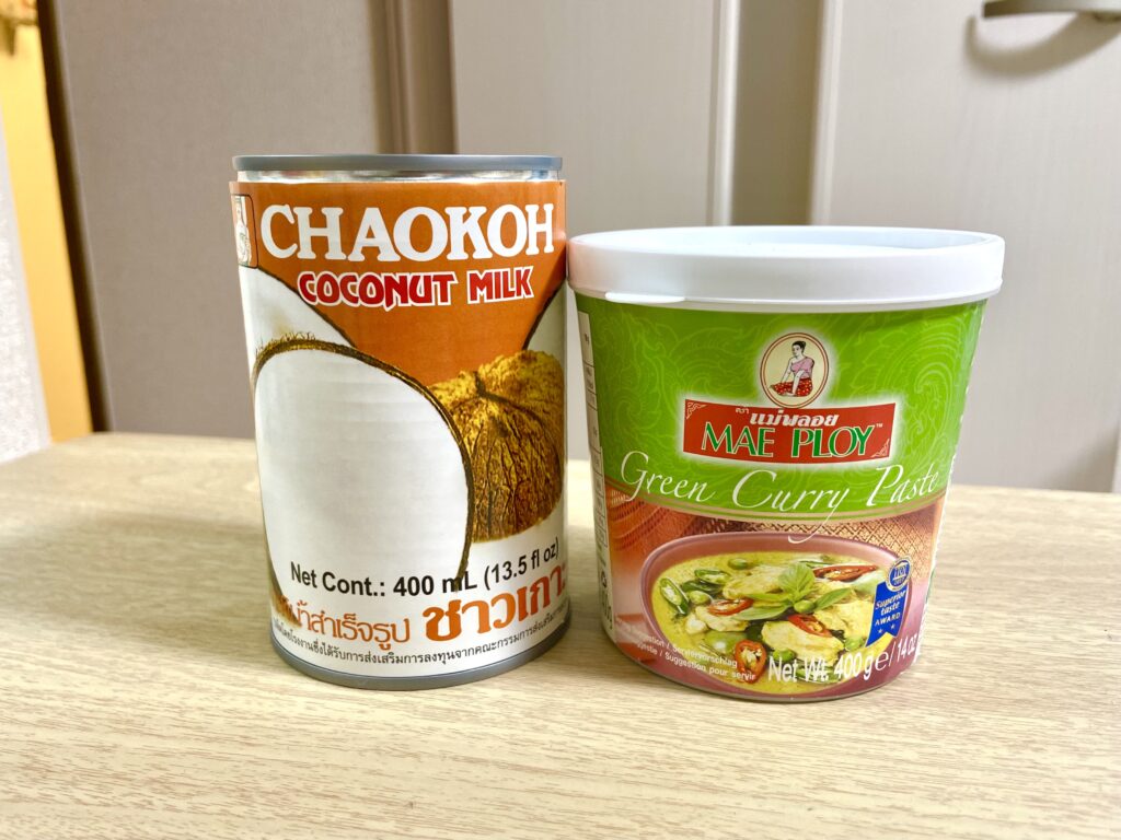 ↓今回使用したおすすめグリーンカレーペーストとココナッツミルク缶↓