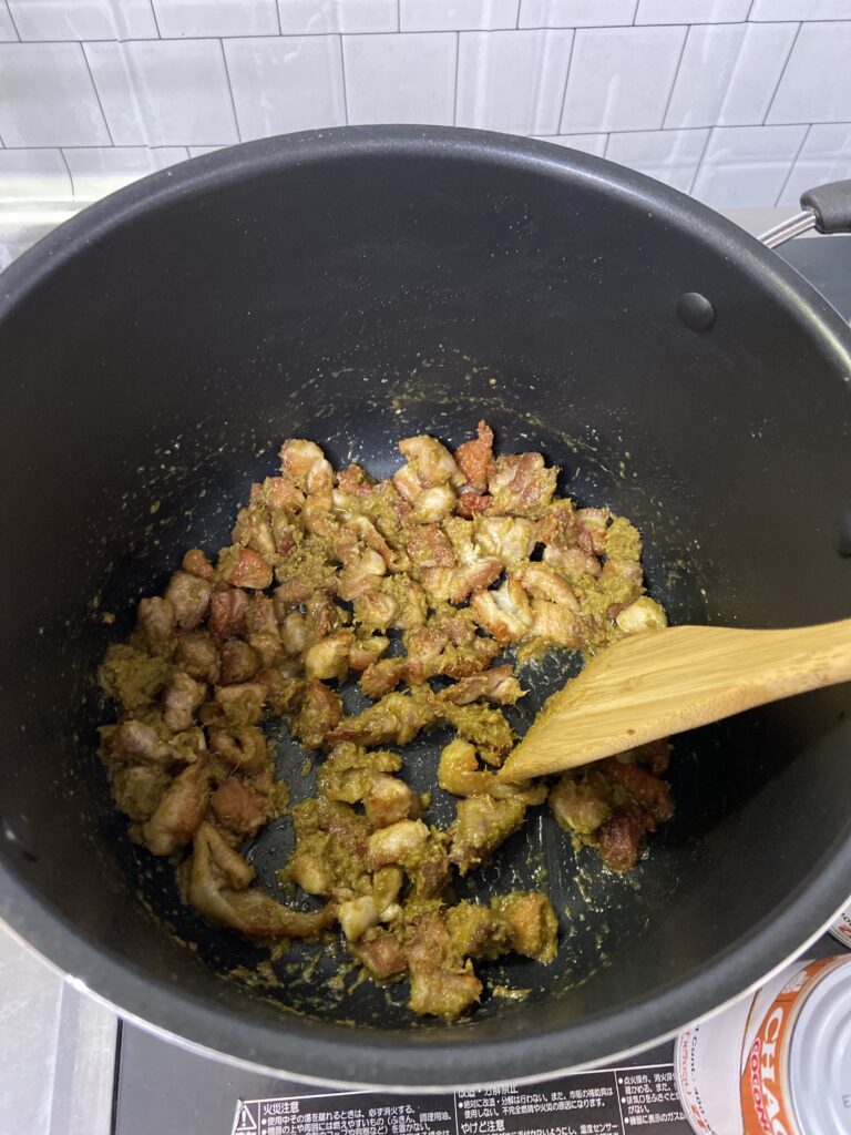 そしてしっかり焼き味が付いたら材料①のバターとカレーペーストを加えて中火のまま1分ほど炒める。