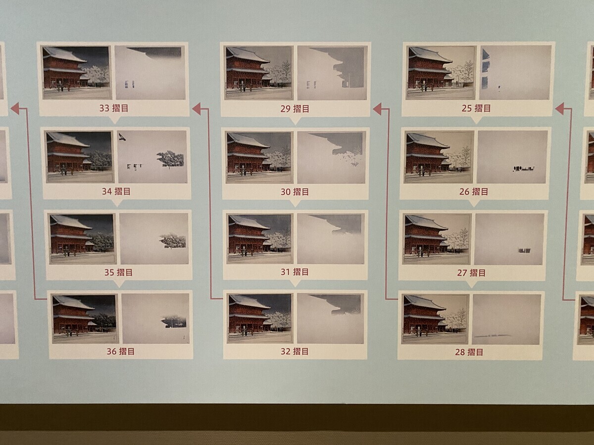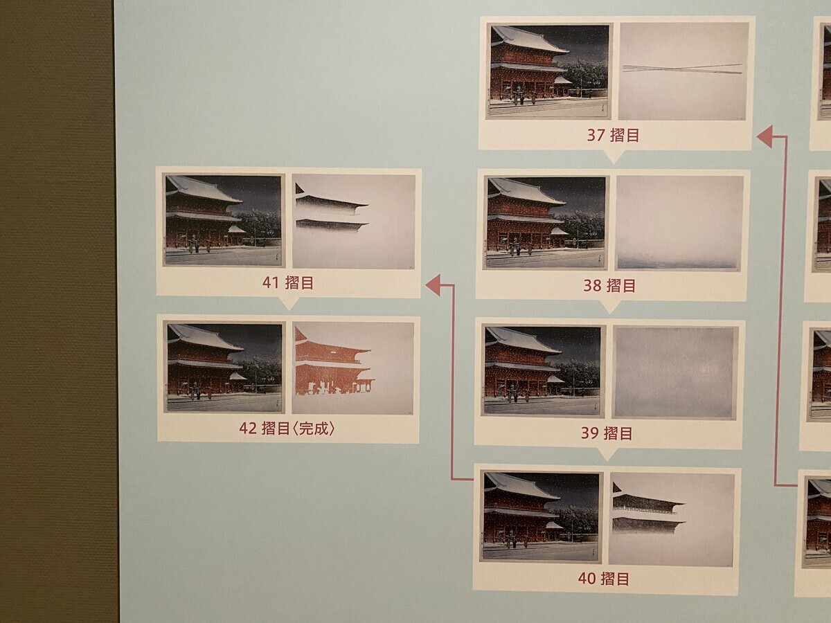 今回は川瀬巴水の代表作の一つ《増上寺之雪》が 42回も摺りを重ねていることがわかる展示になっていた。文部省文化財保護委員会が木版画の制作技術を記録するため、渡邊版画店に製作を委嘱した作品である。