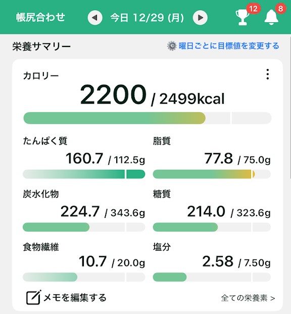 本日のカロリーはいつも通りの1700kcal台。明日もこの程度に抑えたいと思っています。