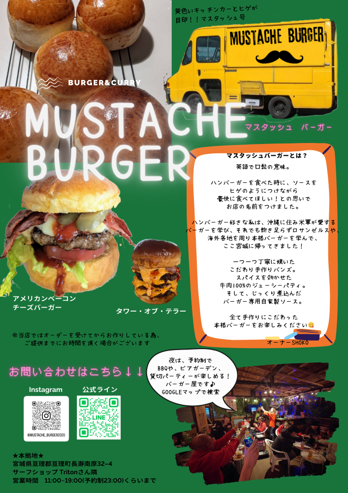 Mustache(マスタッシュ)=口ひげ のように、ソースをヒゲのように付けて豪快にお召し上がりください🍔🌴