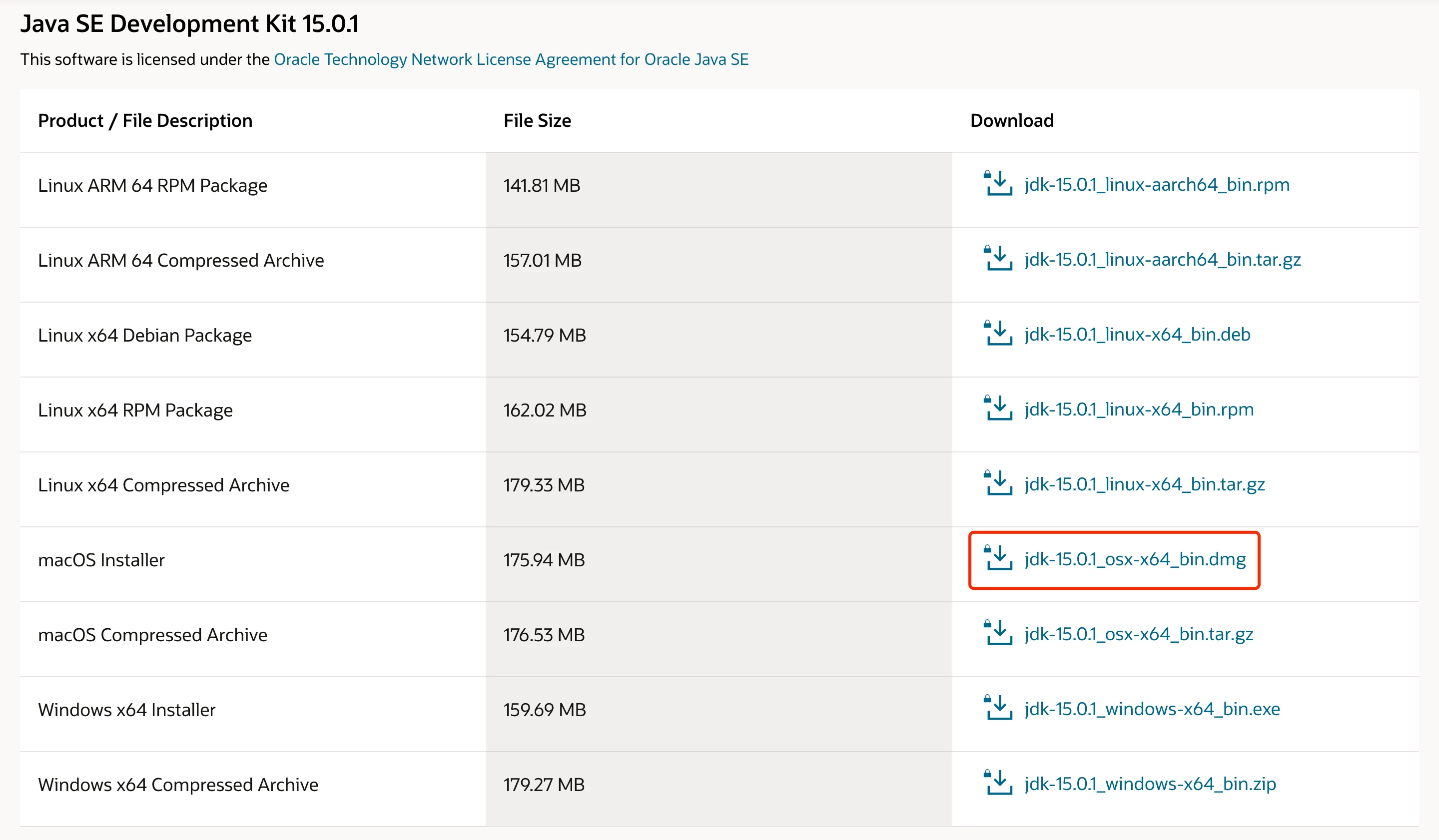 我们在下载详情页面可以找到如下图这样的一个表格,在最右侧 Download 一列中找到jdk-15.0.1_osx-x64_bin.dmg一项,单击鼠标左键。