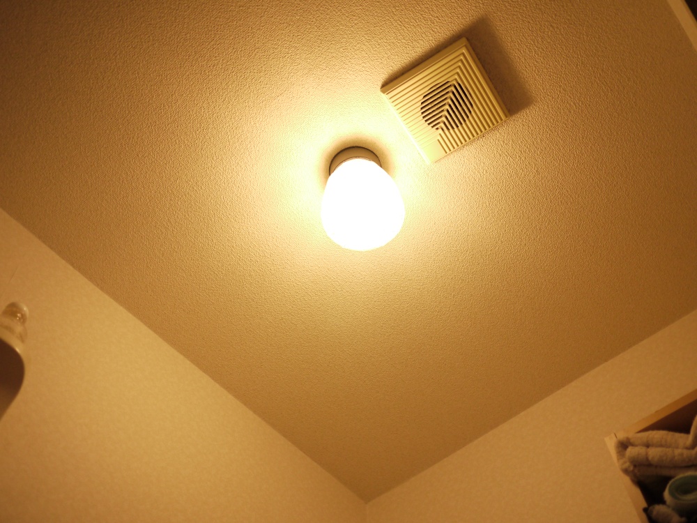 洗面所なので座ることはなく、視線は下よりも上に向くため、上が暗く感じるLED電球のほうが若干不利に思える。トイレならちょうどいいかも。