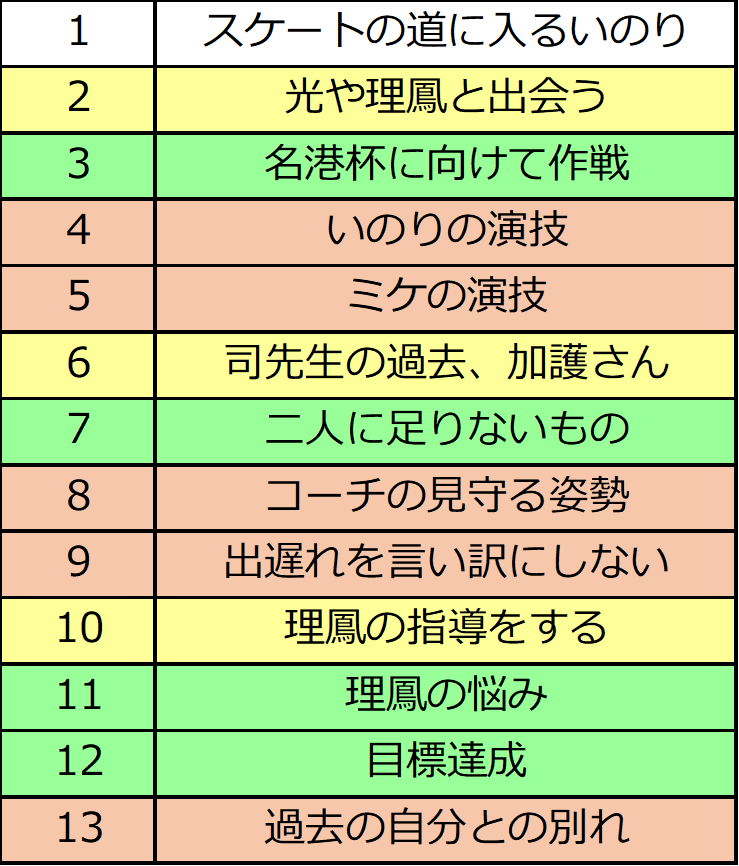 絵馬の演技やジャッキー先生の話から、「無理に焦らなくても結果を出せる」「ケガは選手生命を左右させる」と2人が認識したからです。ここは「遅れと焦り」が主題でして、司先生がスケートを遅く始める、いのりがプログラムに遅れそうになる、絵馬が焦るなどといった「遅れと焦り」に関連するエピソードが多く配置されています。